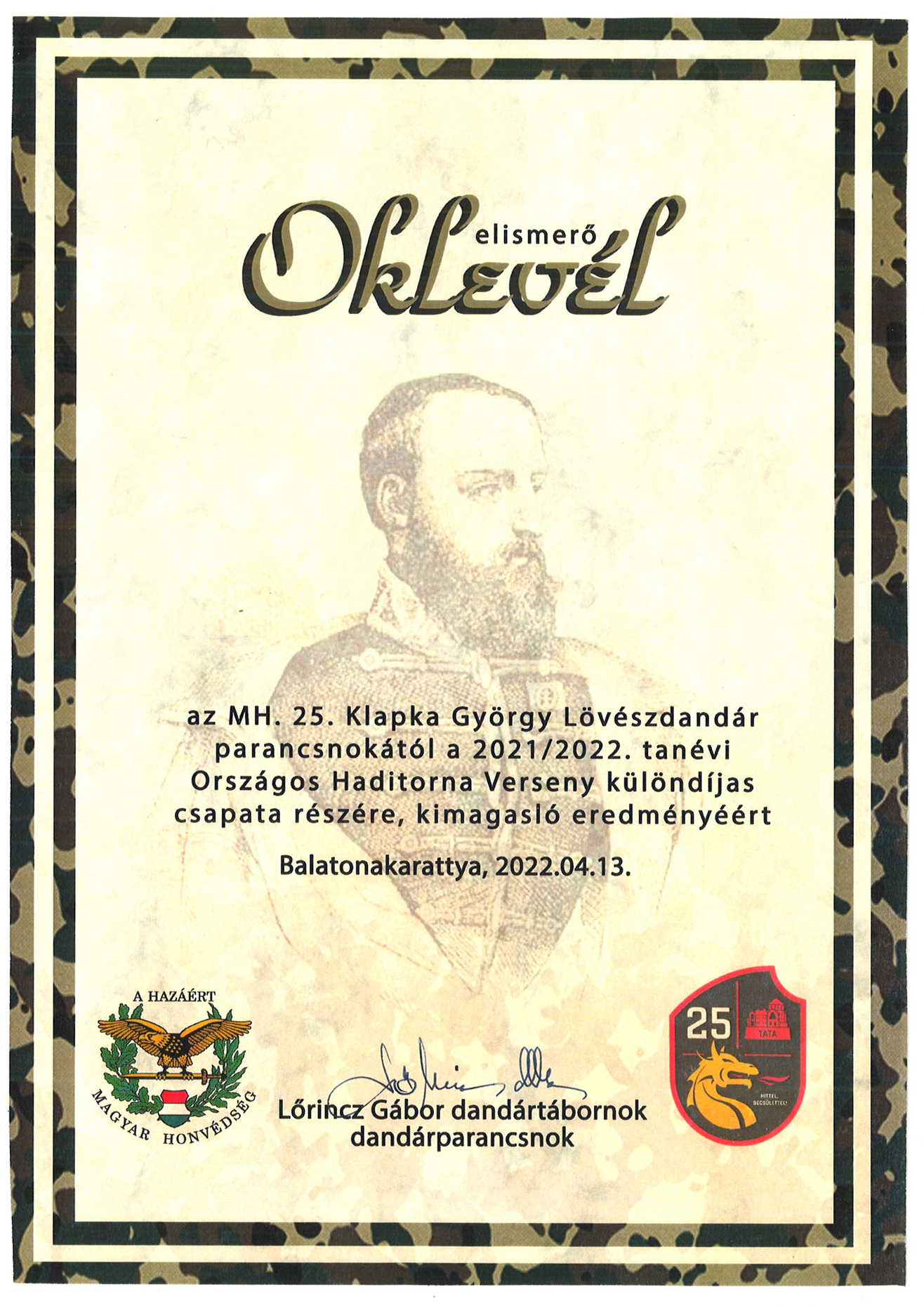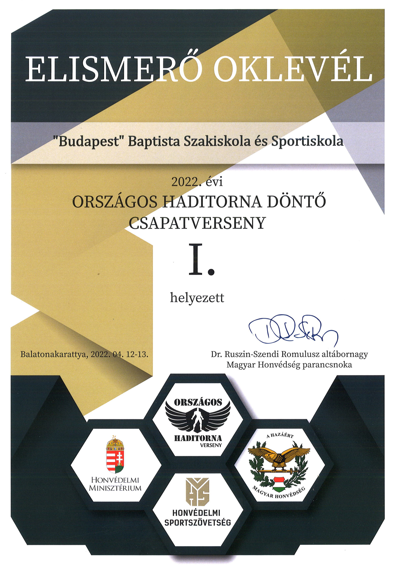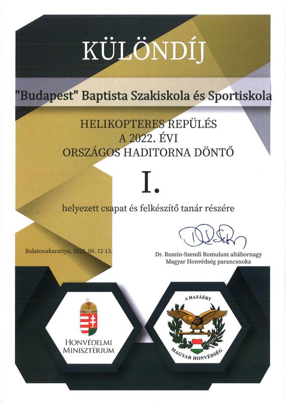 Intézményünk tanulói részt vettek 2022. április 12-13. között Balatonakarattyán megrendezésre került 2022.évi Országos Haditorna Döntőn . A csapatversenyben első helyezést értek el. A kimagasló eredményükért Különdíjban is részesültek.